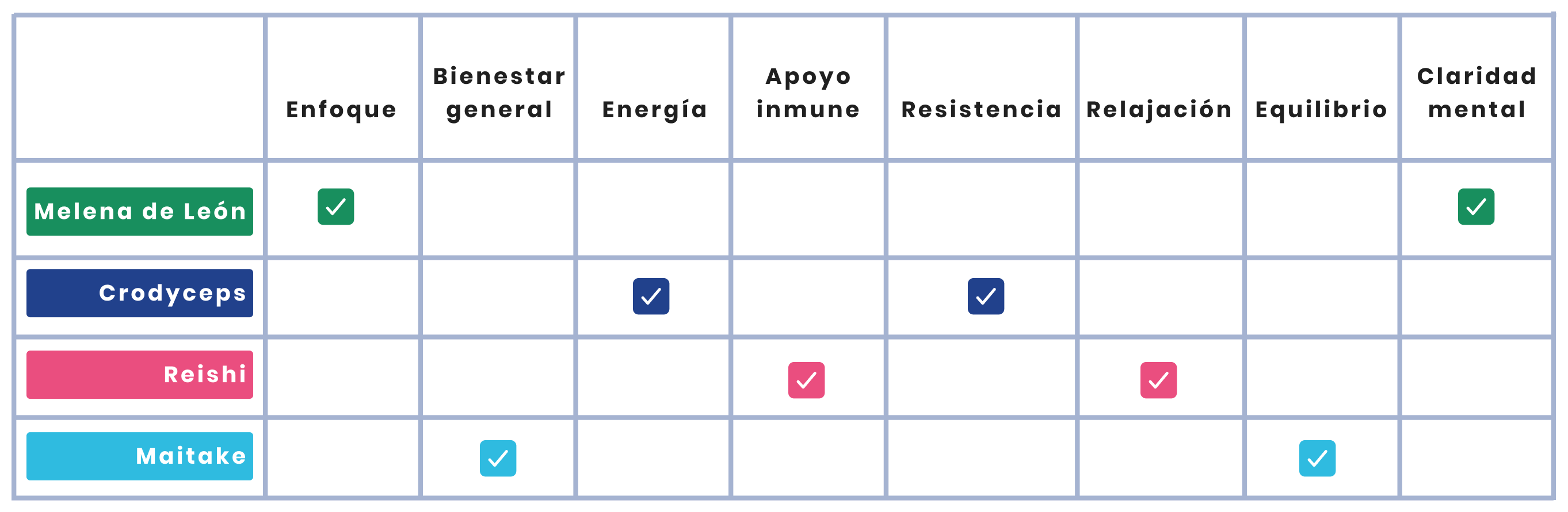 Descripción: “Conocido como el adaptógeno del cerebro, la Melena de León apoya tu memoria y enfoque, ayudando a mantener la mente ágil y creativa.”